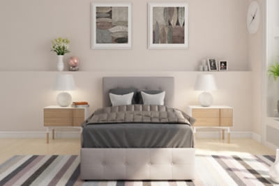 This beautiful upholstered platform bed features upholstered headboard that adds a contemporary chic look to your bedroom and filled in thick foam to add extra comfort.